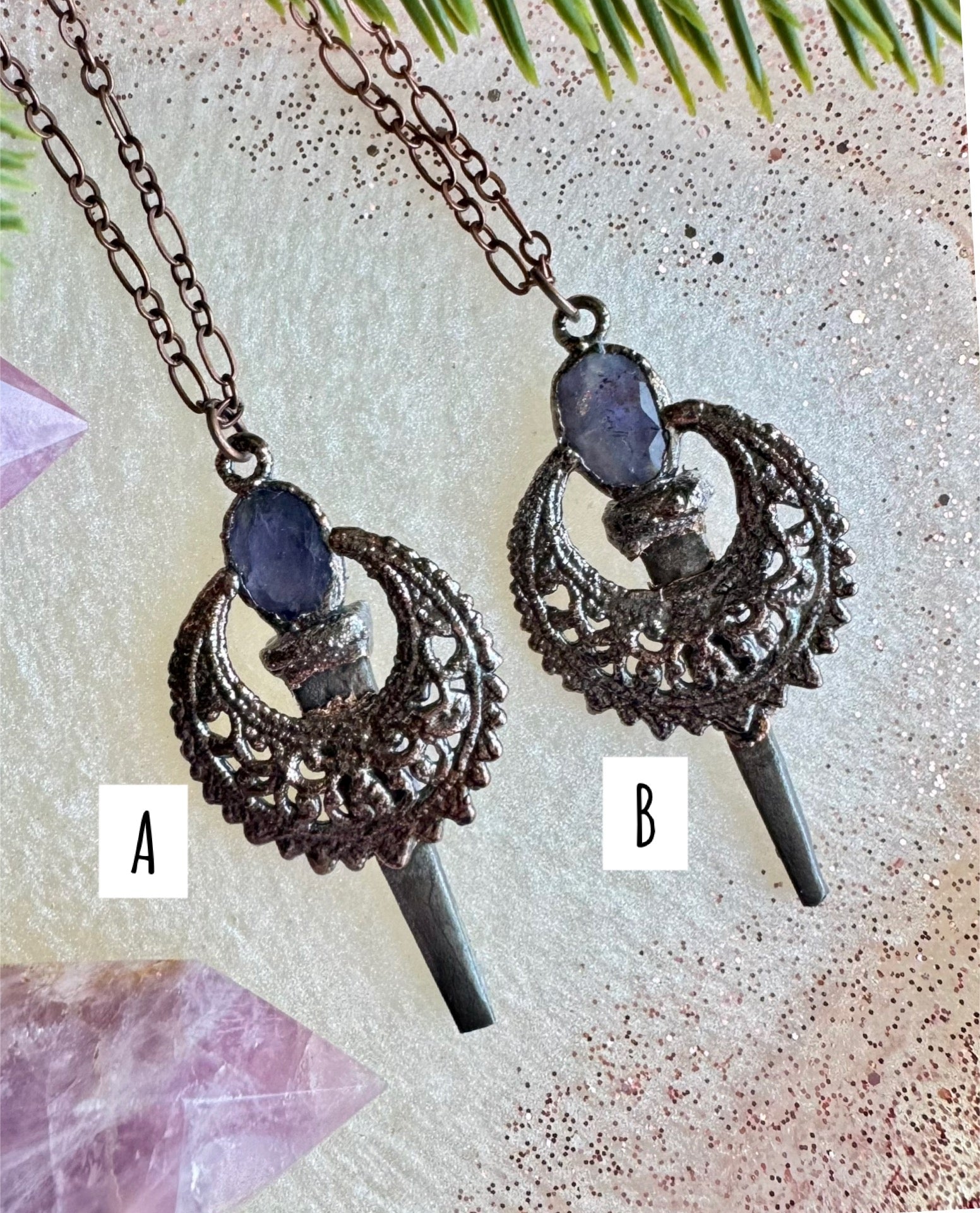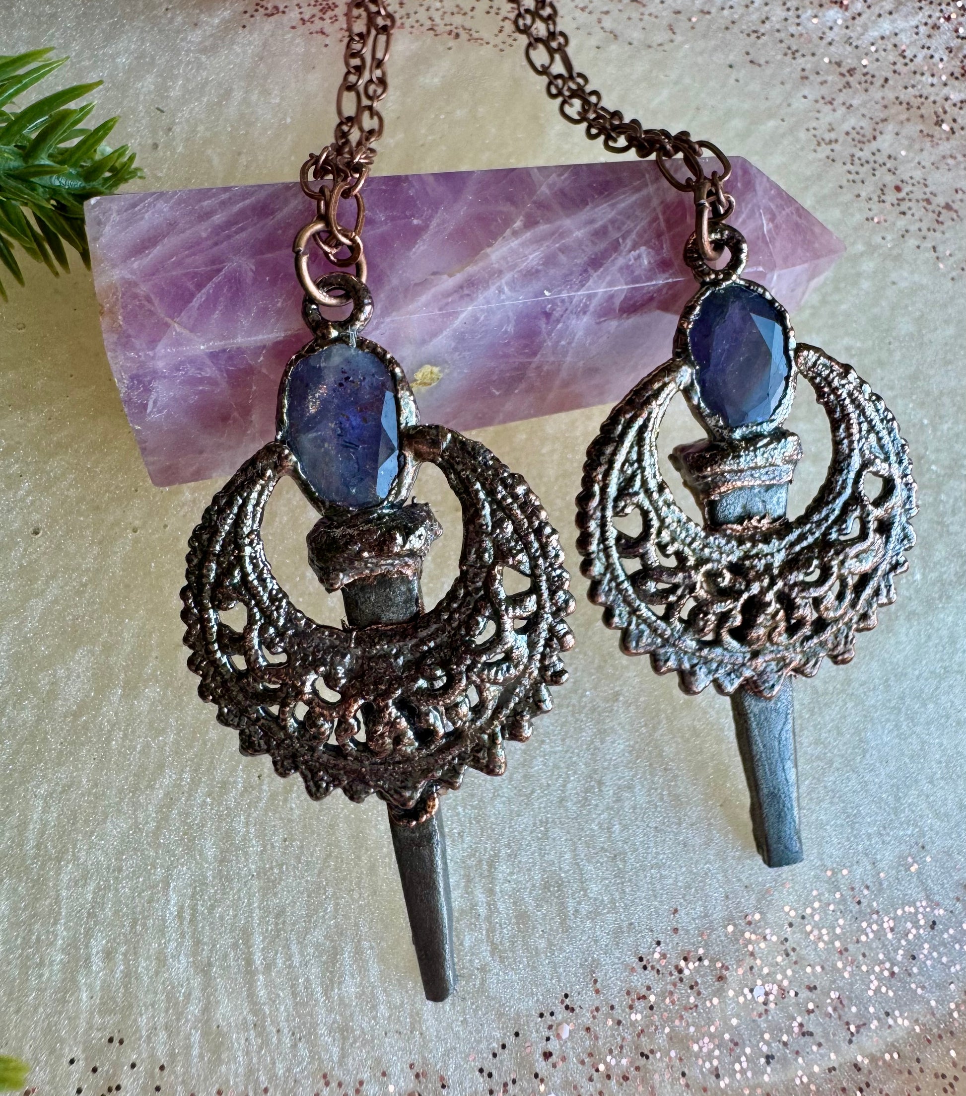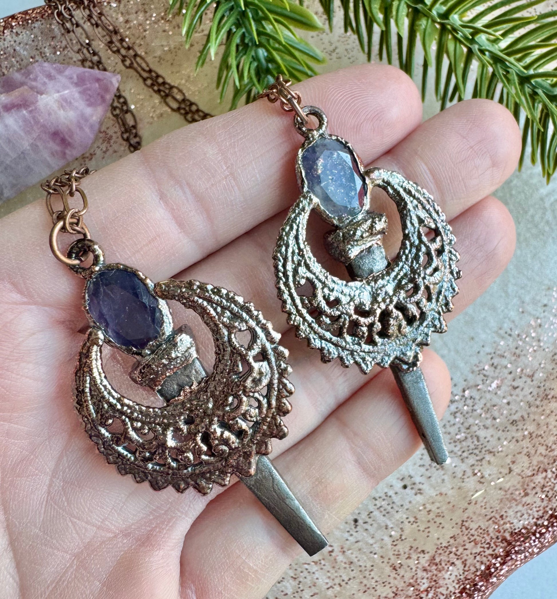 ”Beloved” these pieces were created with radiant purple Iolite stones and real coffin nails.