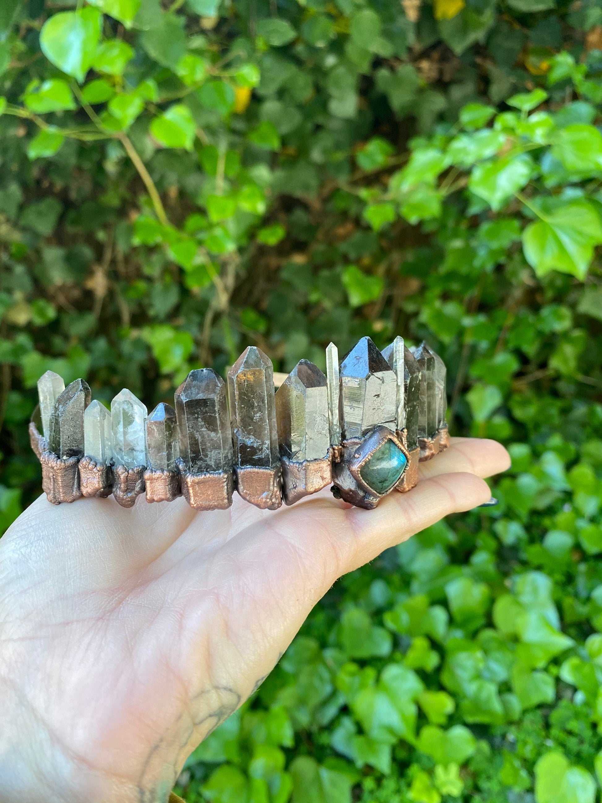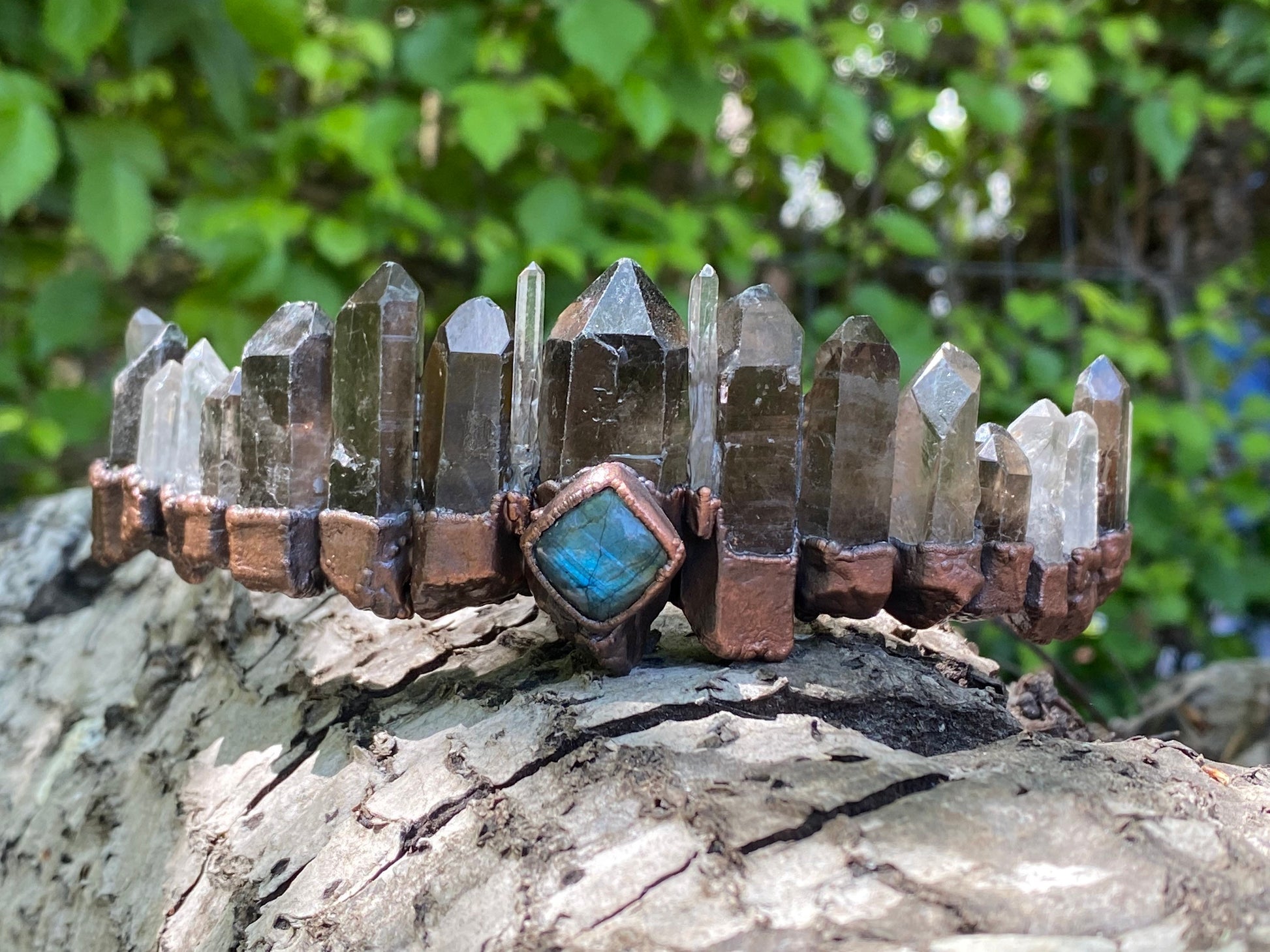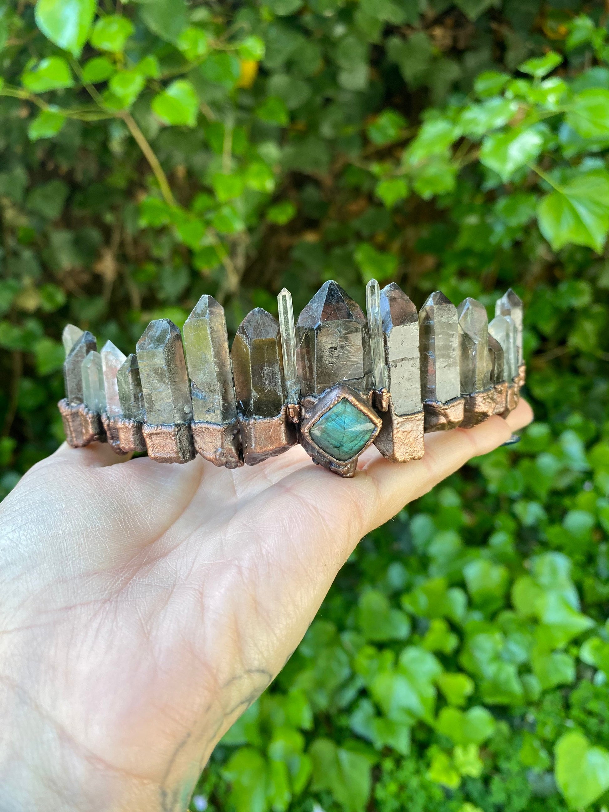 Crystal crown tiara Smokey and clear Quartz and labradorite wedding headdress bohemian witch head piece