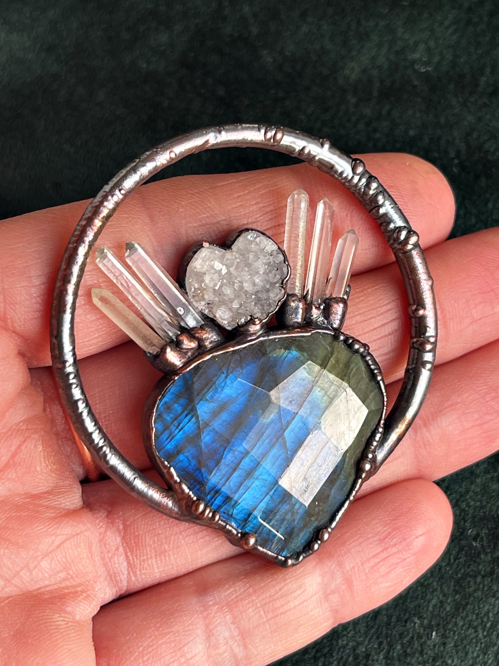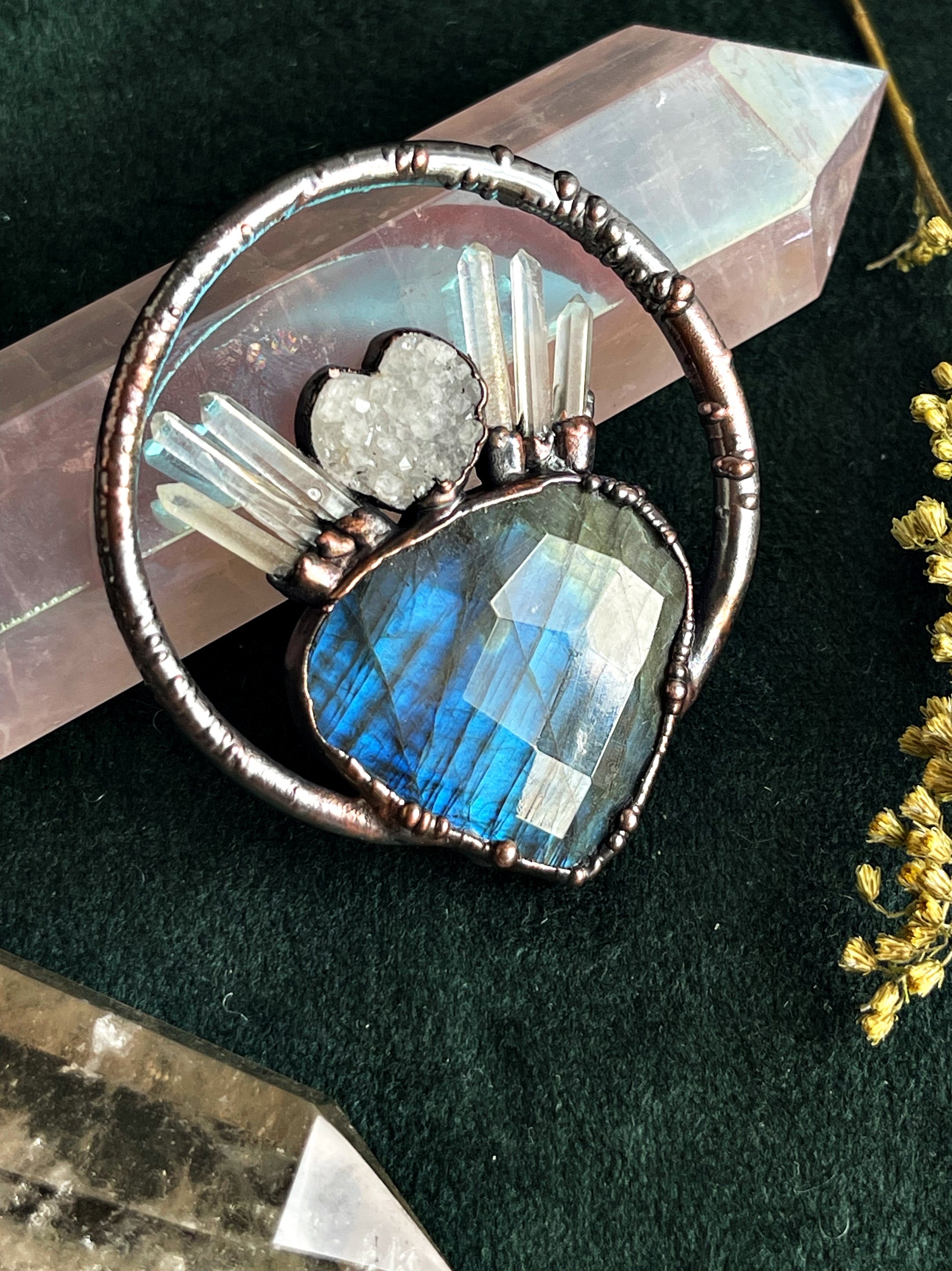 Included on this piece is a white druzy heart and clear Quartz.