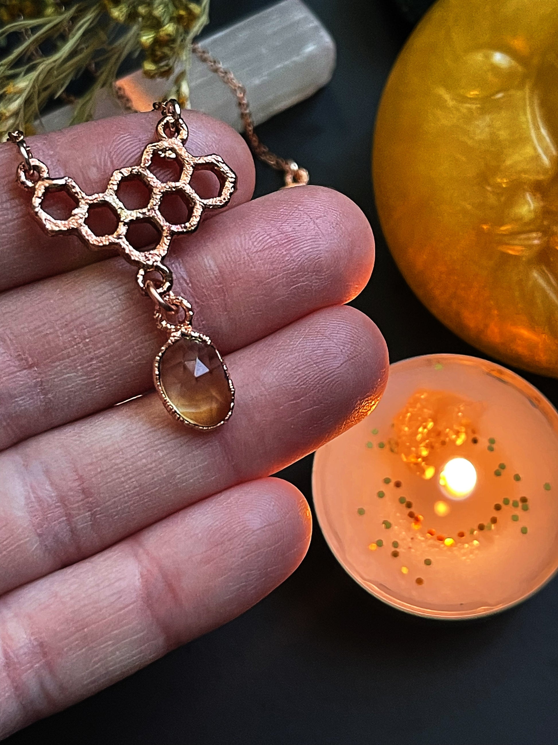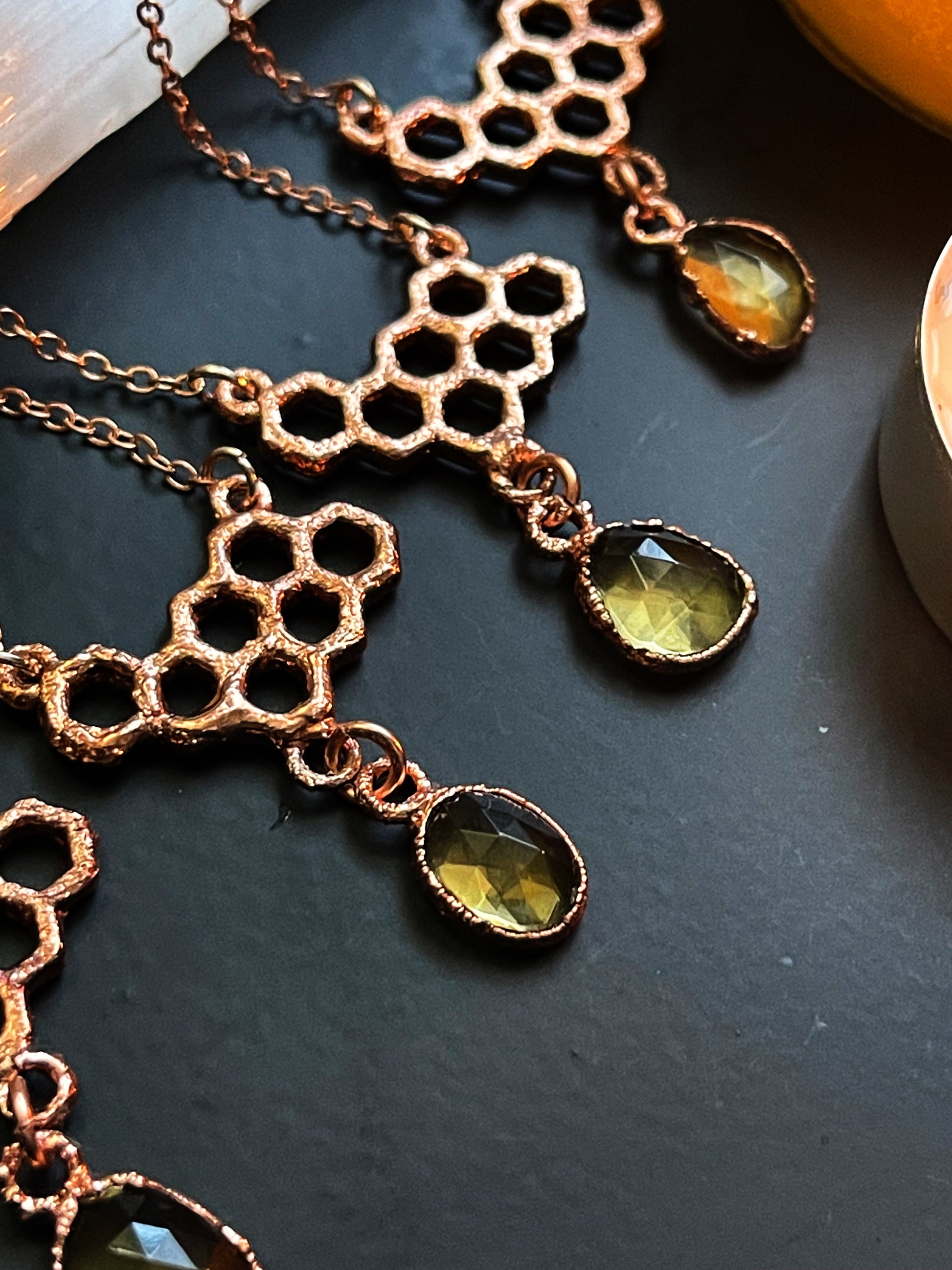 All stones are set in pure solid copper settings. Technique is known as Electroforming.