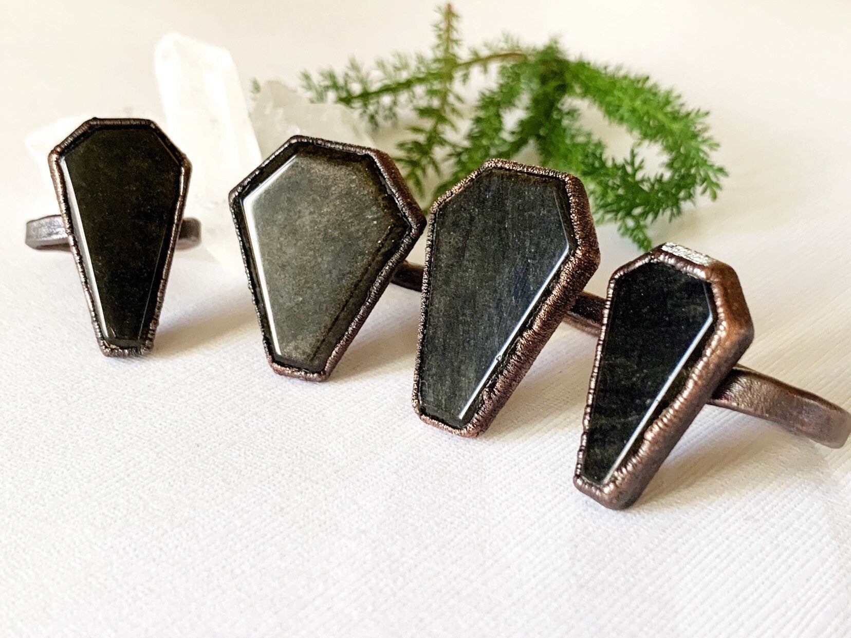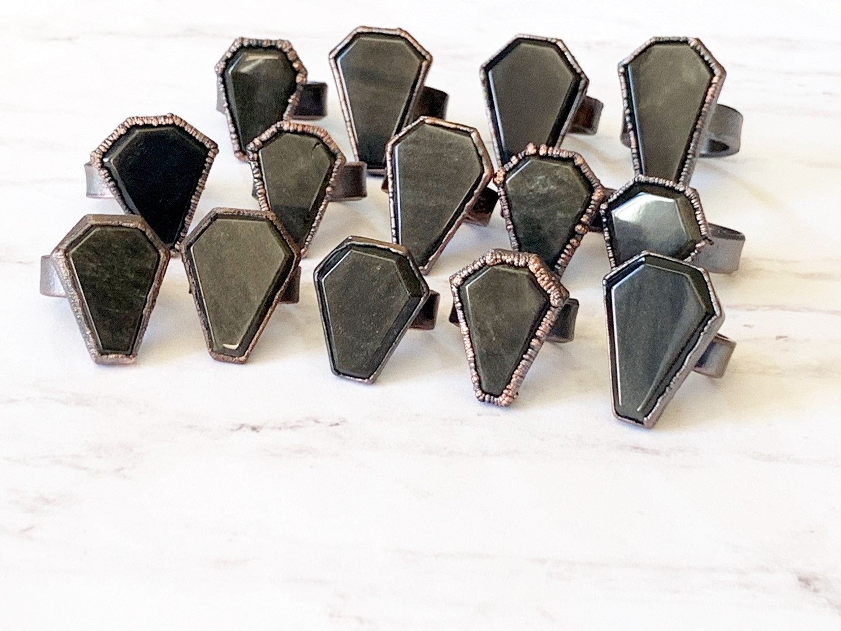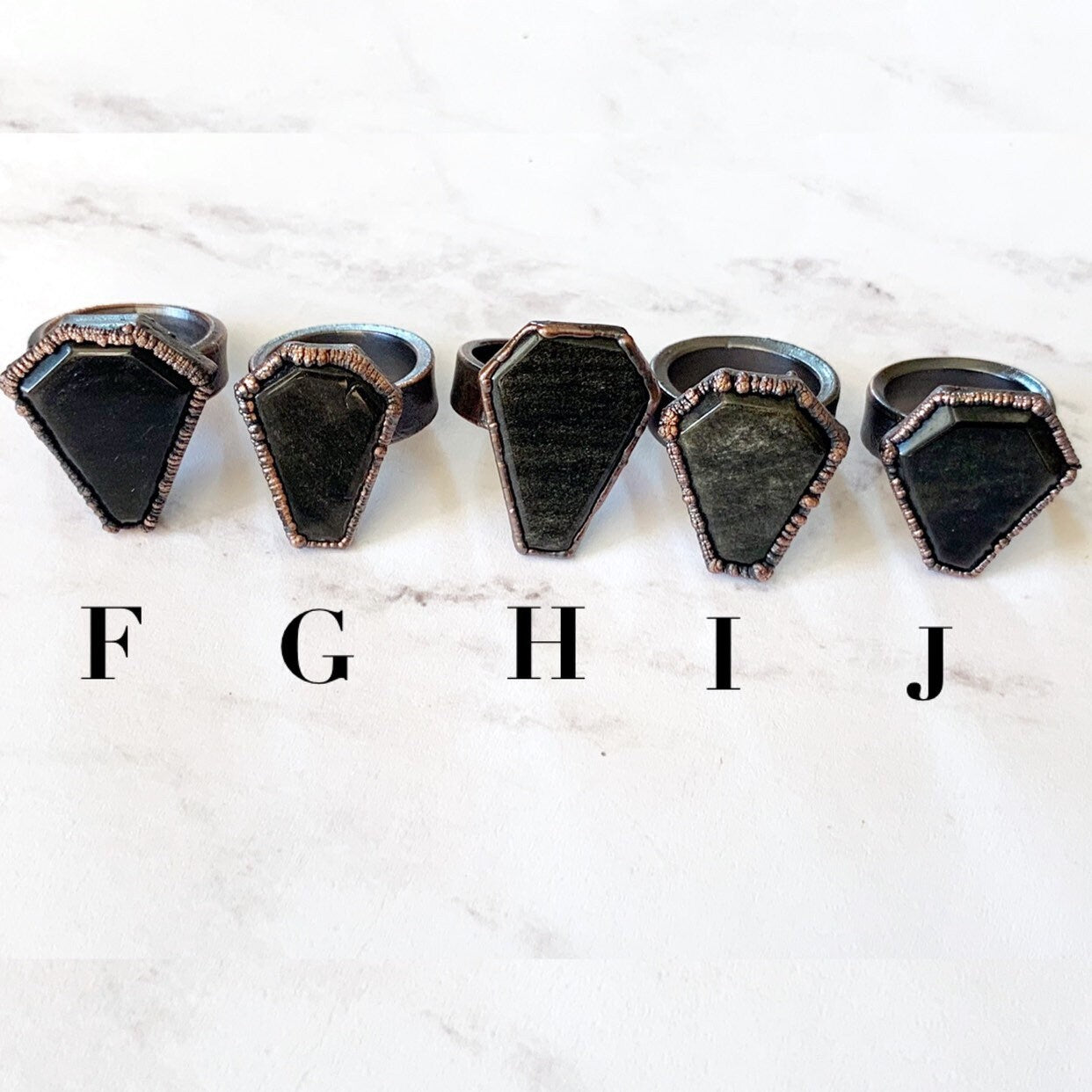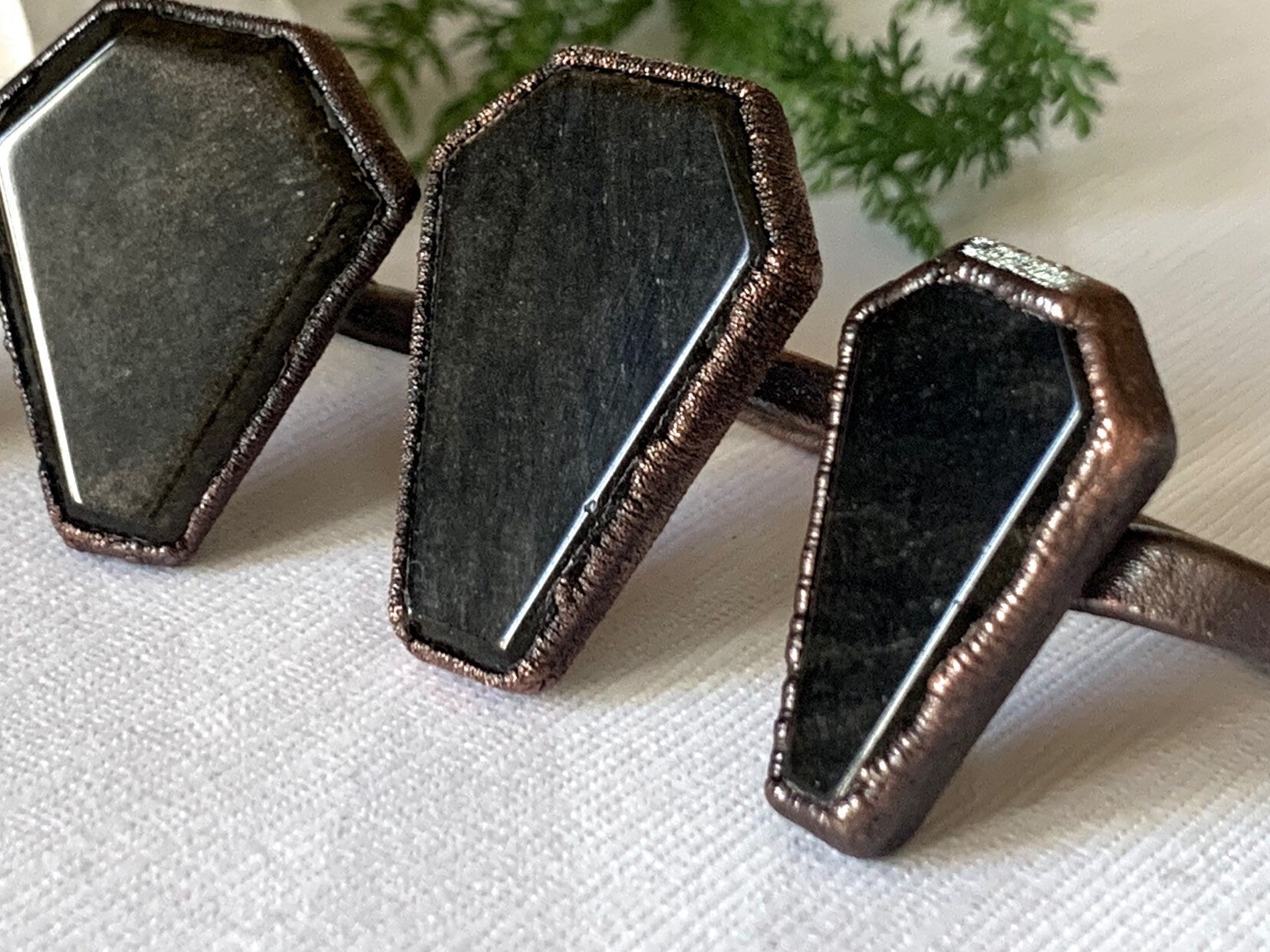 Obsidian coffin cut rings/Dragon Glass ring/gold sheen obsidian/coffin ring /black obsidian/electroformed/copper