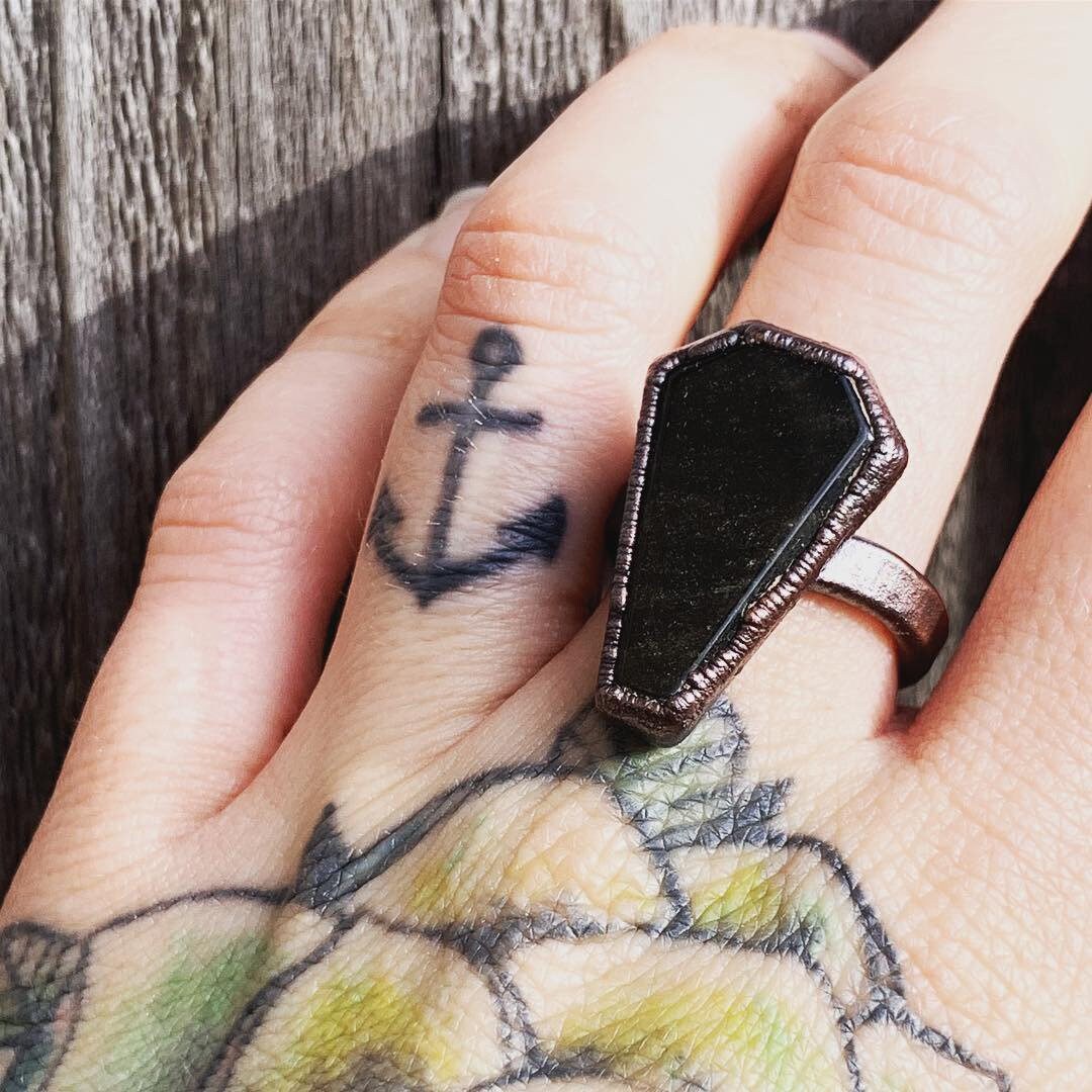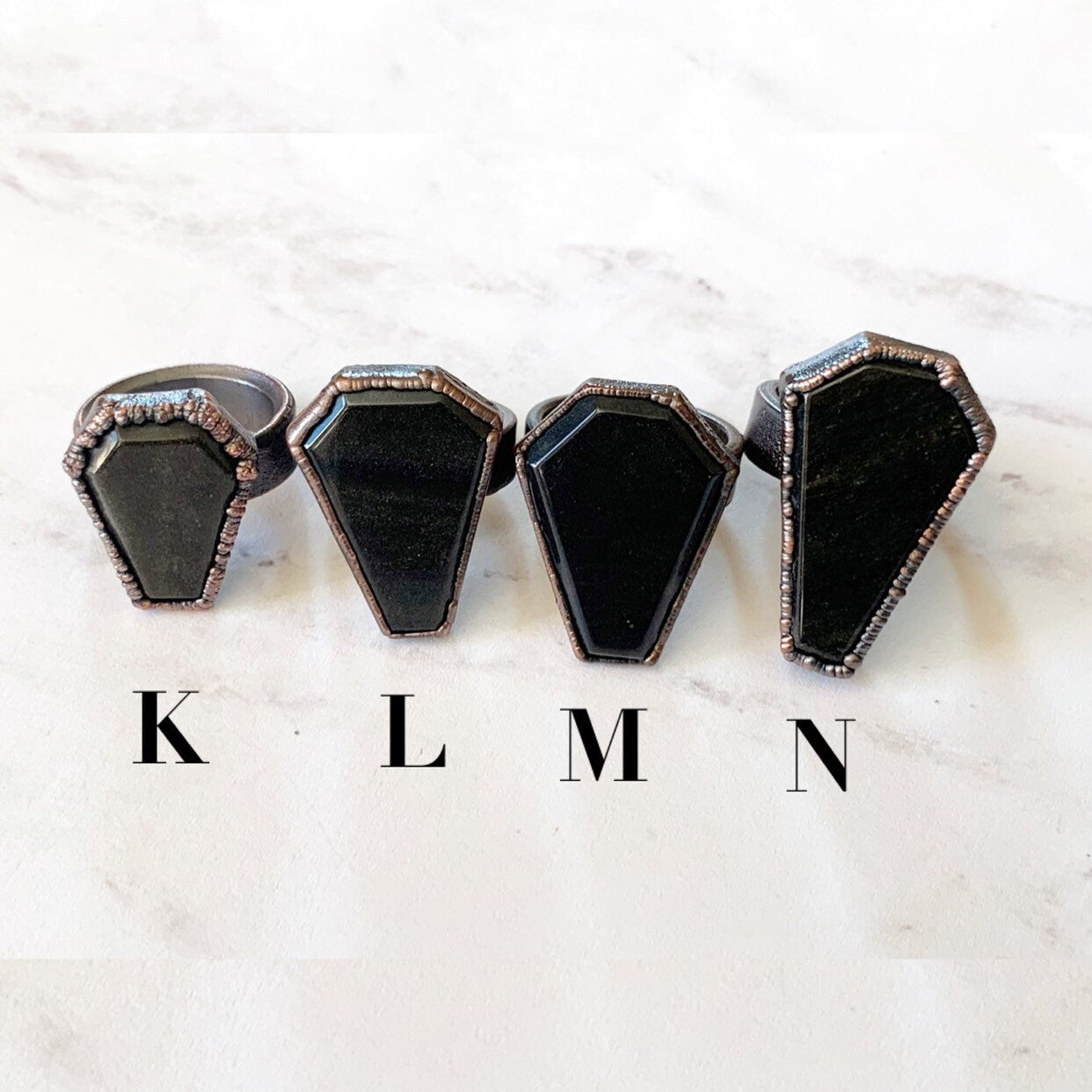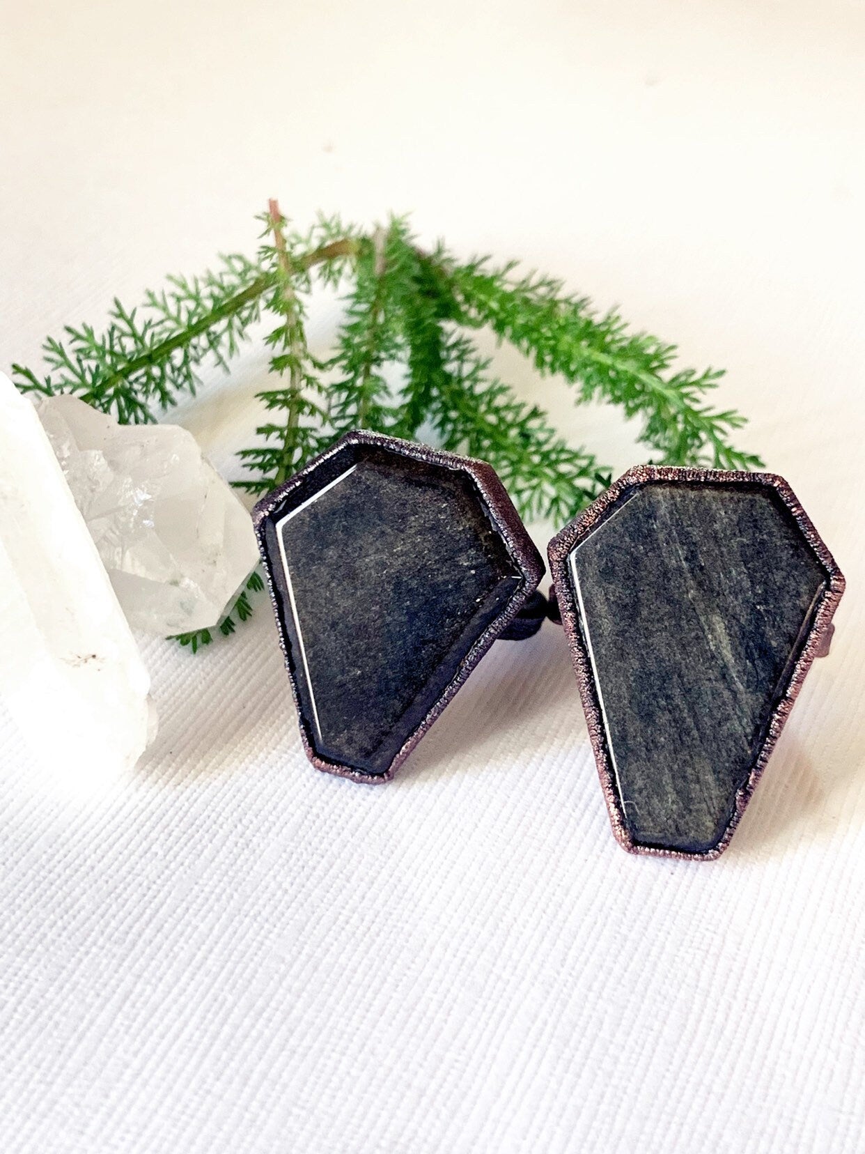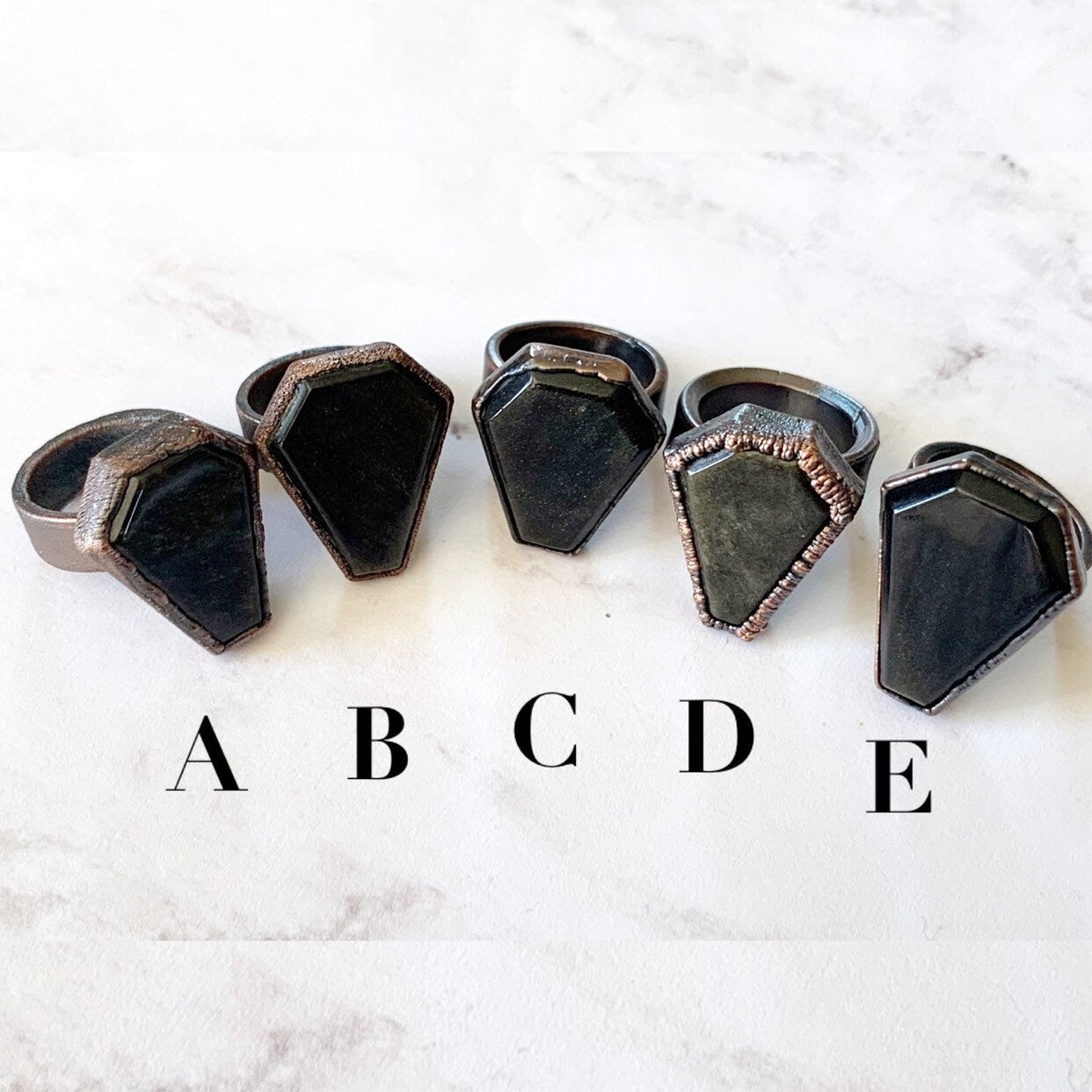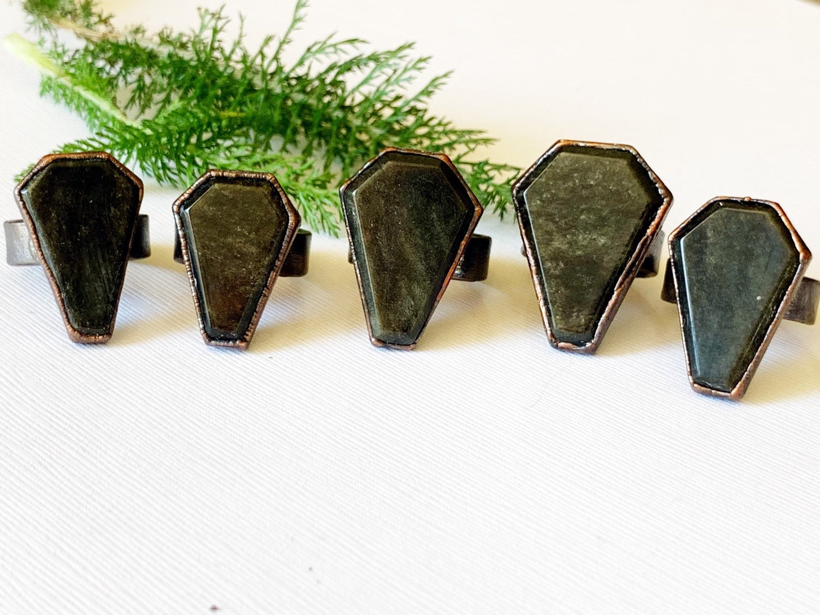 Obsidian coffin cut rings/Dragon Glass ring/gold sheen obsidian/coffin ring /black obsidian/electroformed/copper