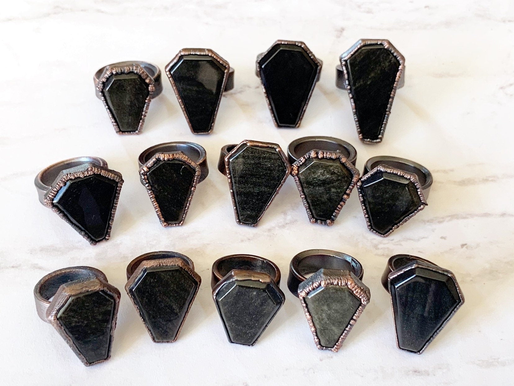 These rings are absolutely stunning. The obsidian has a beautiful gold sheen in certain light. This obsidian is hard to come by especially in the coffin style cut.