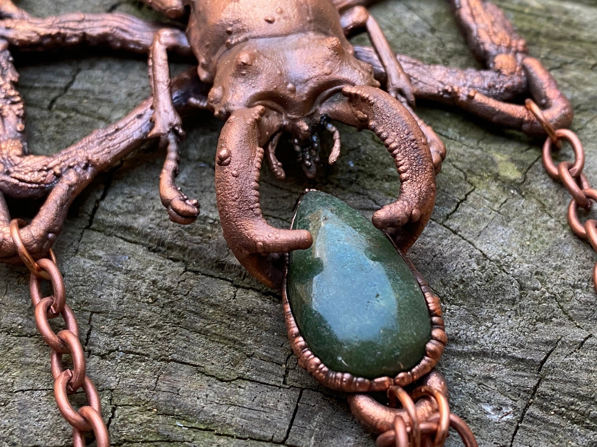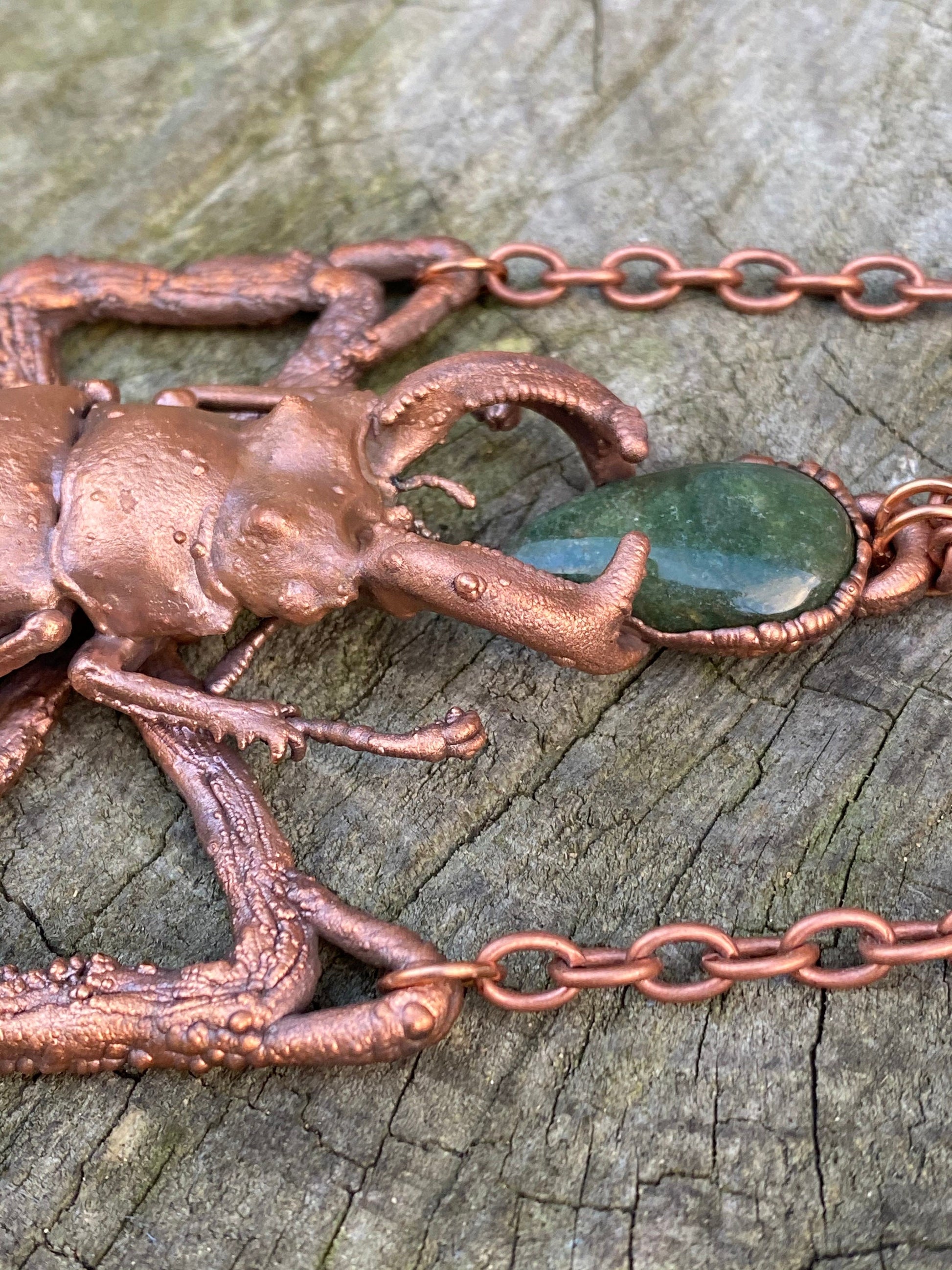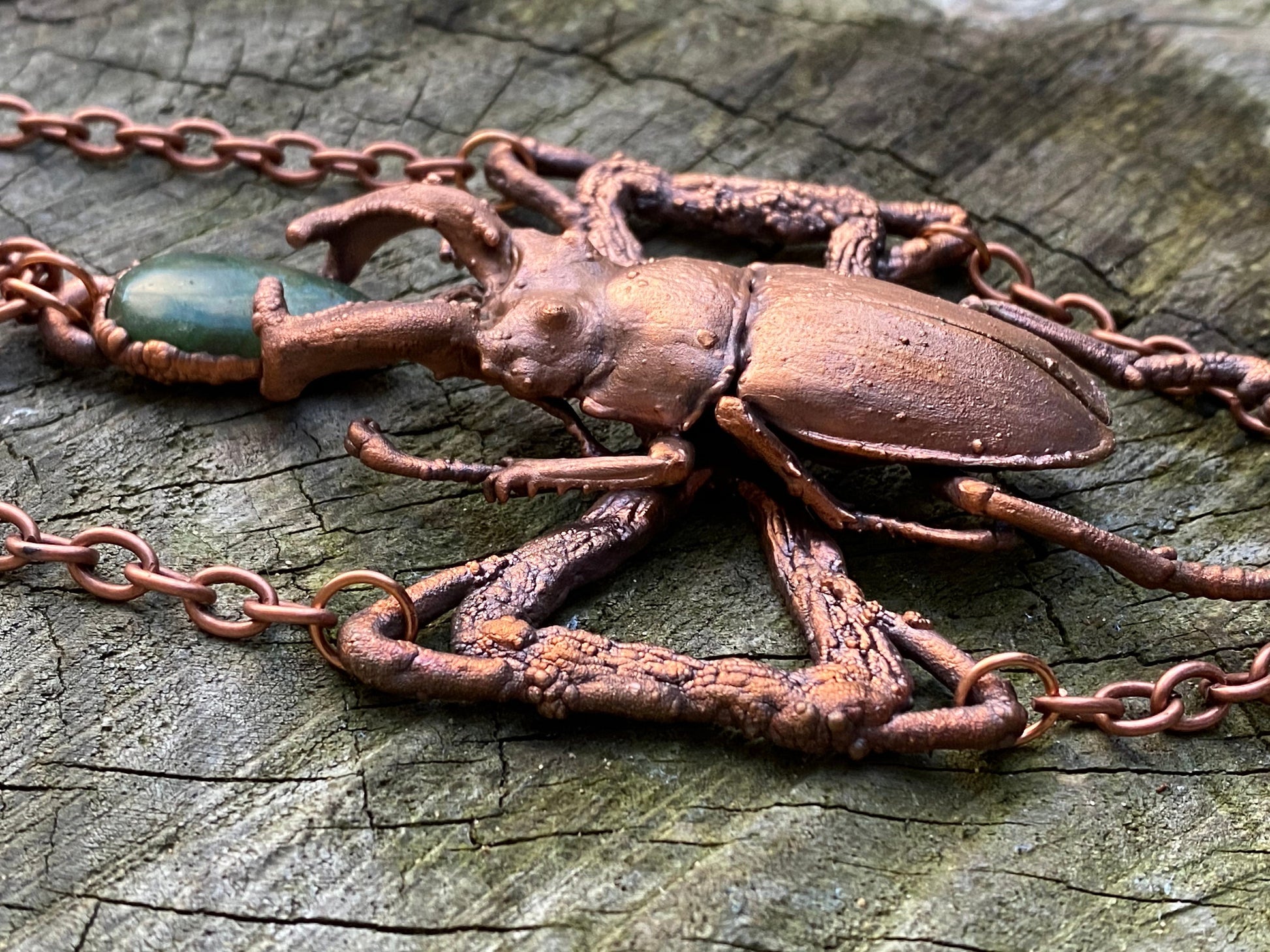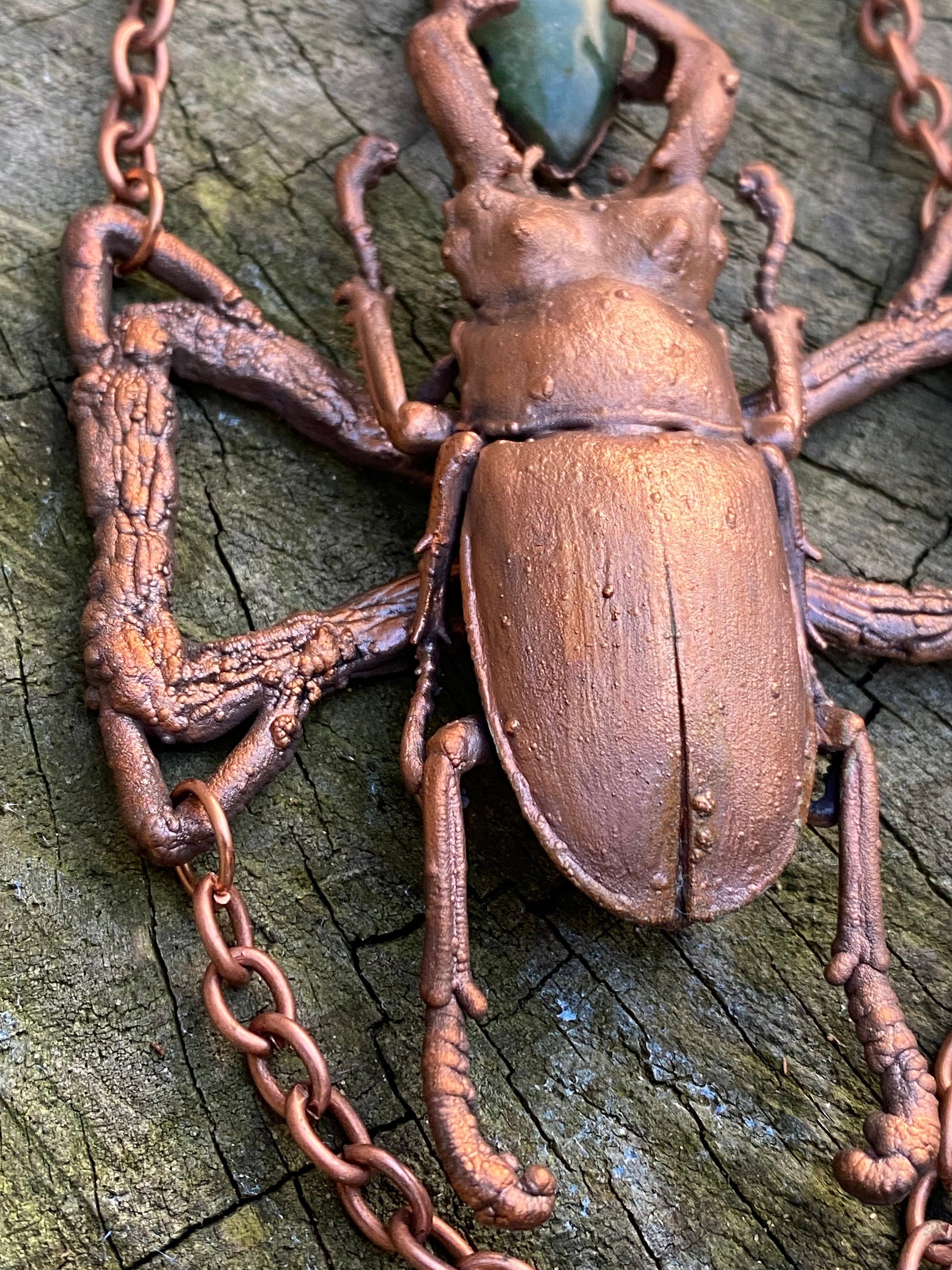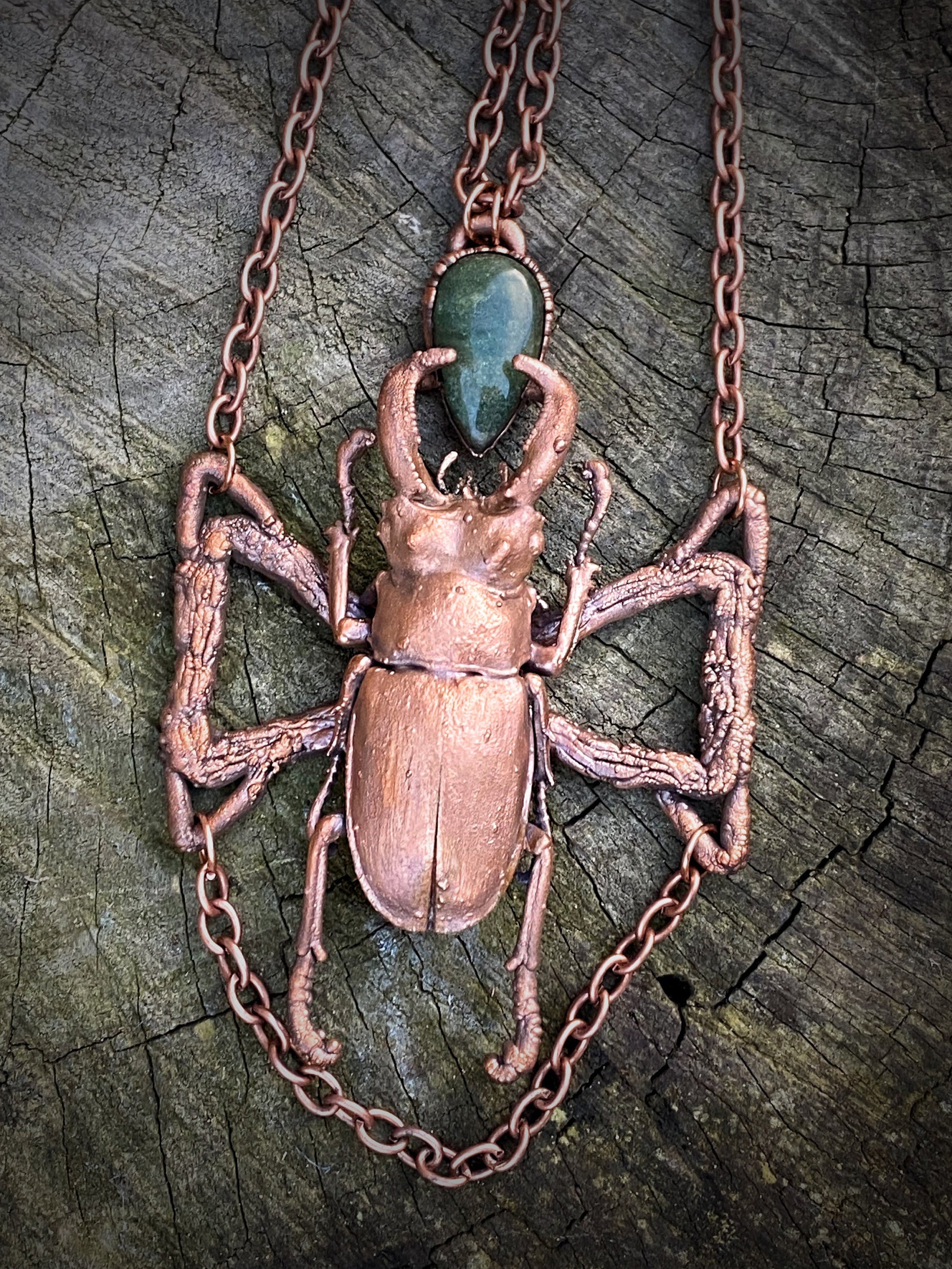 Real stag beetle and green jade pendant statement necklace Electroformed jewelry