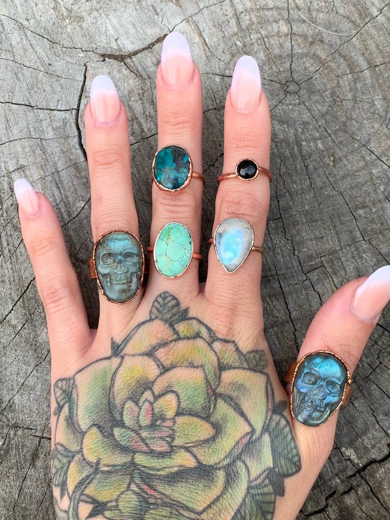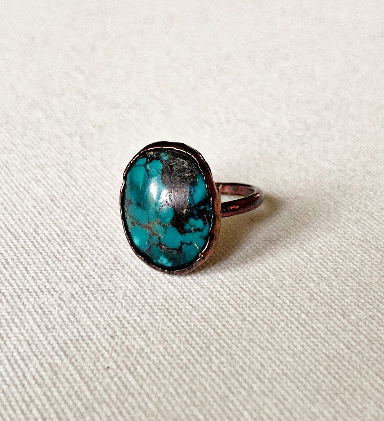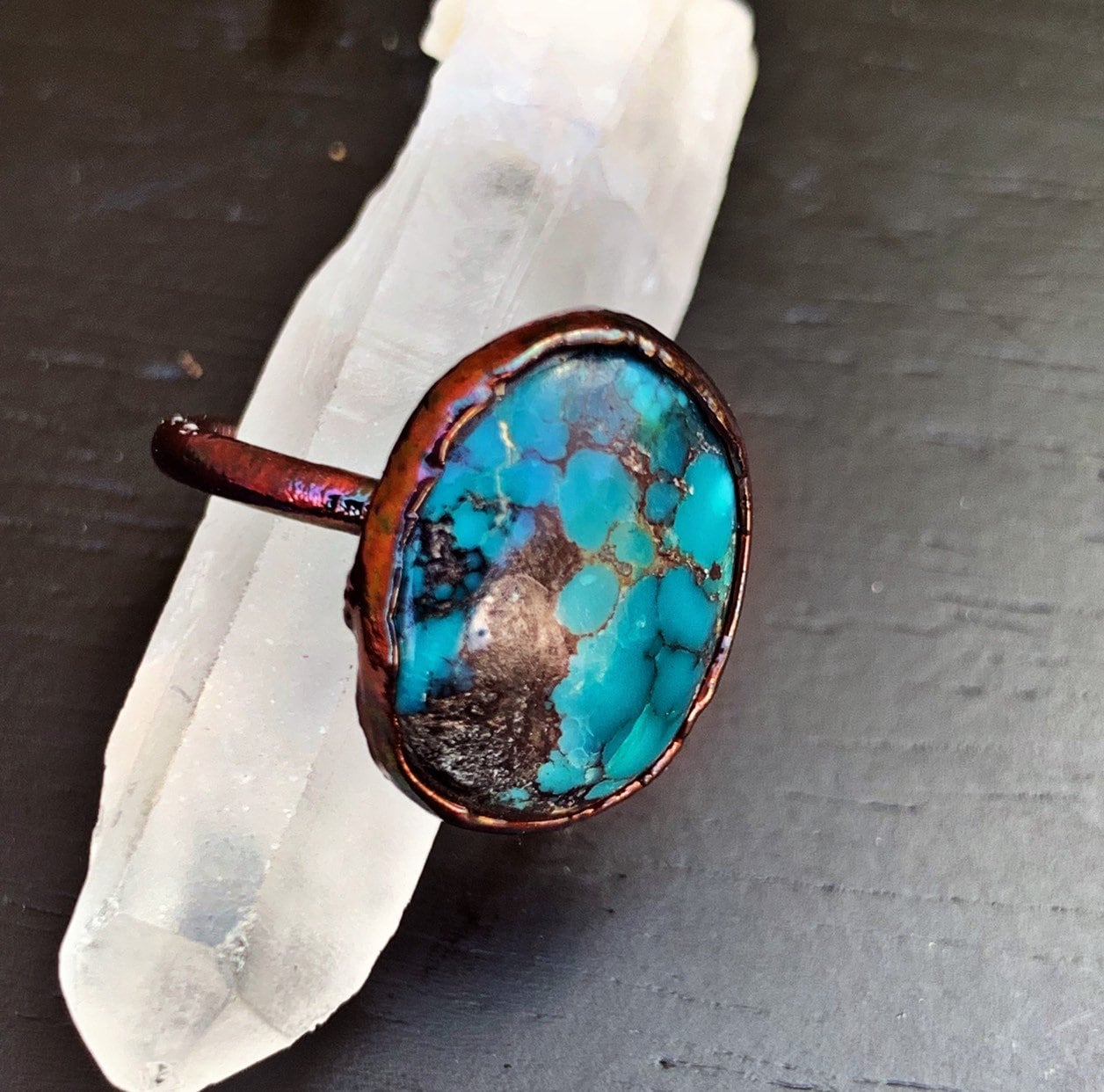 You can’t go wrong with a classic turquoise and copper ring! This ring was hand created through a process know as electroforming.